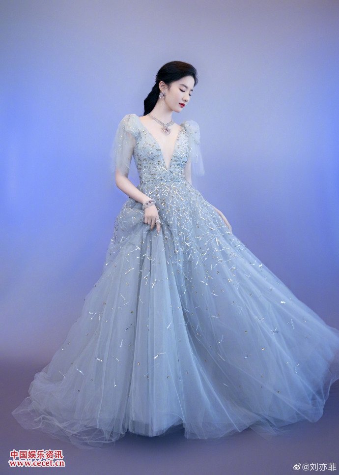 劉亦菲深V藍色紗裙照 雪白的肌膚優(yōu)雅大氣