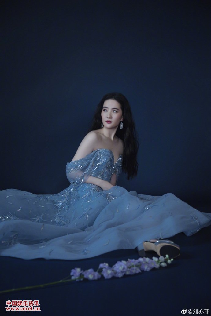 劉亦菲淺藍色薄紗閃片禮裙 一字肩鎖骨殺驚艷