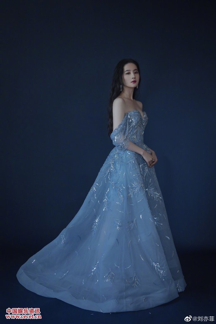 劉亦菲淺藍色薄紗閃片禮裙 一字肩鎖骨殺驚艷