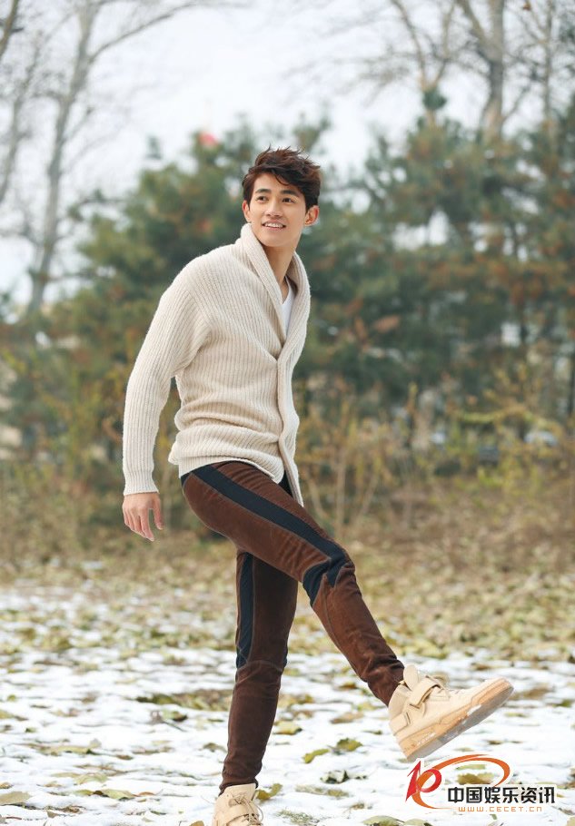 李子峰戶(hù)外寫(xiě)真 米白色毛衣外搭棕色大衣