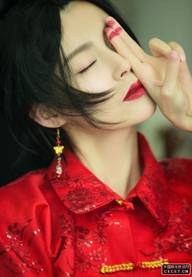盧杉清爽短發(fā)紅衣寫(xiě)真 寓意著(zhù)新年紅紅火火