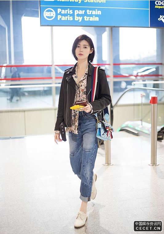 盧杉機場(chǎng)造型曝光 黑色皮衣盡顯柔美與溫婉
