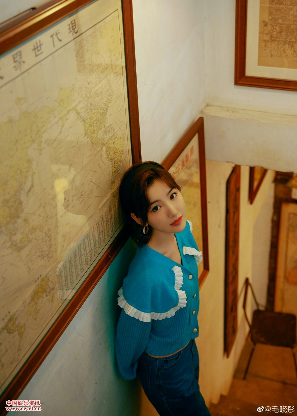 毛曉彤曬出一組藍色花邊領(lǐng)毛衣復古小巷寫(xiě)真