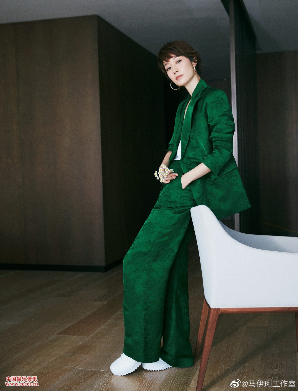 馬伊琍身著(zhù)綠色緞面休閑西服套裝優(yōu)雅干練