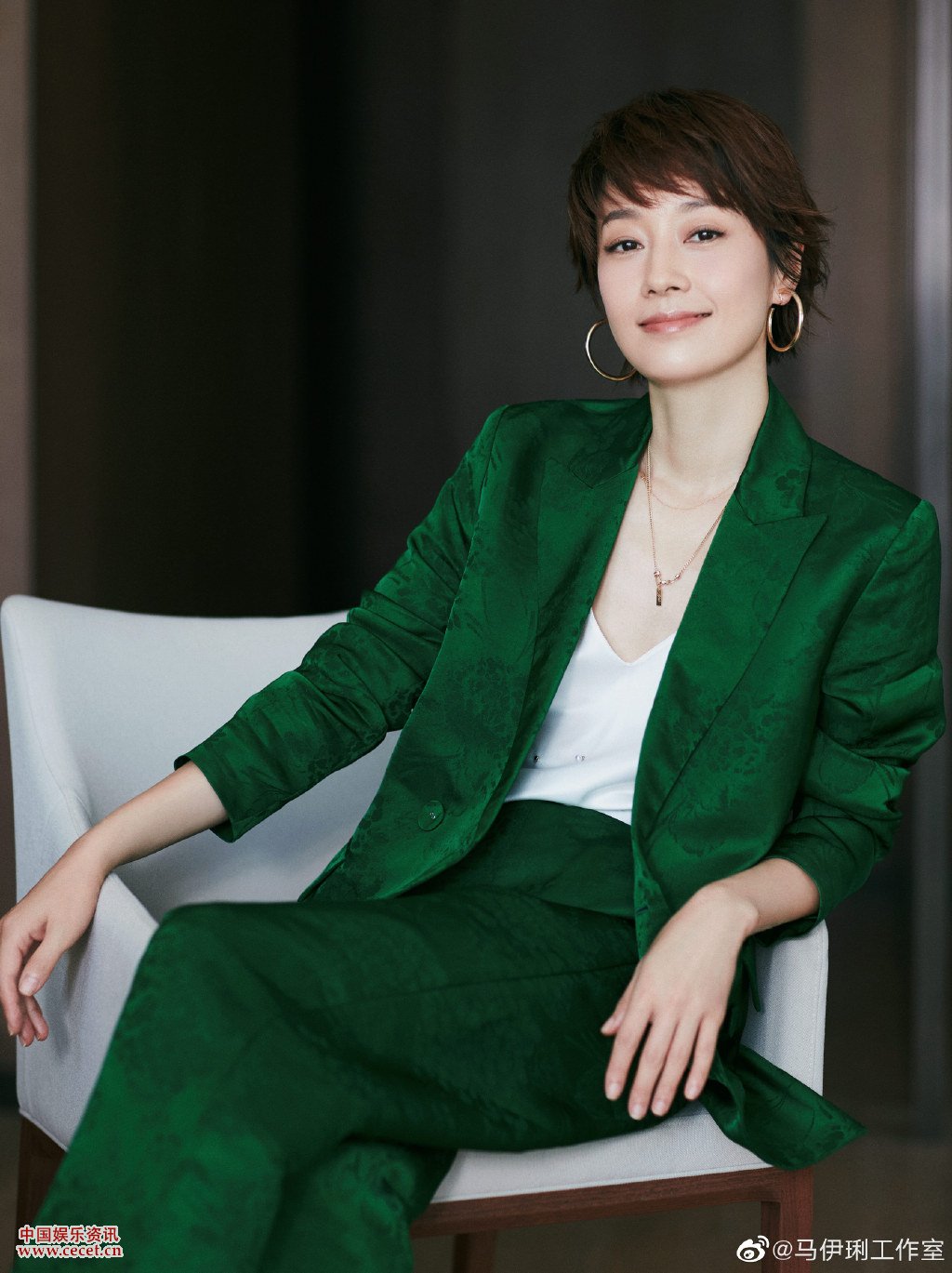 馬伊琍身著(zhù)綠色緞面休閑西服套裝優(yōu)雅干練