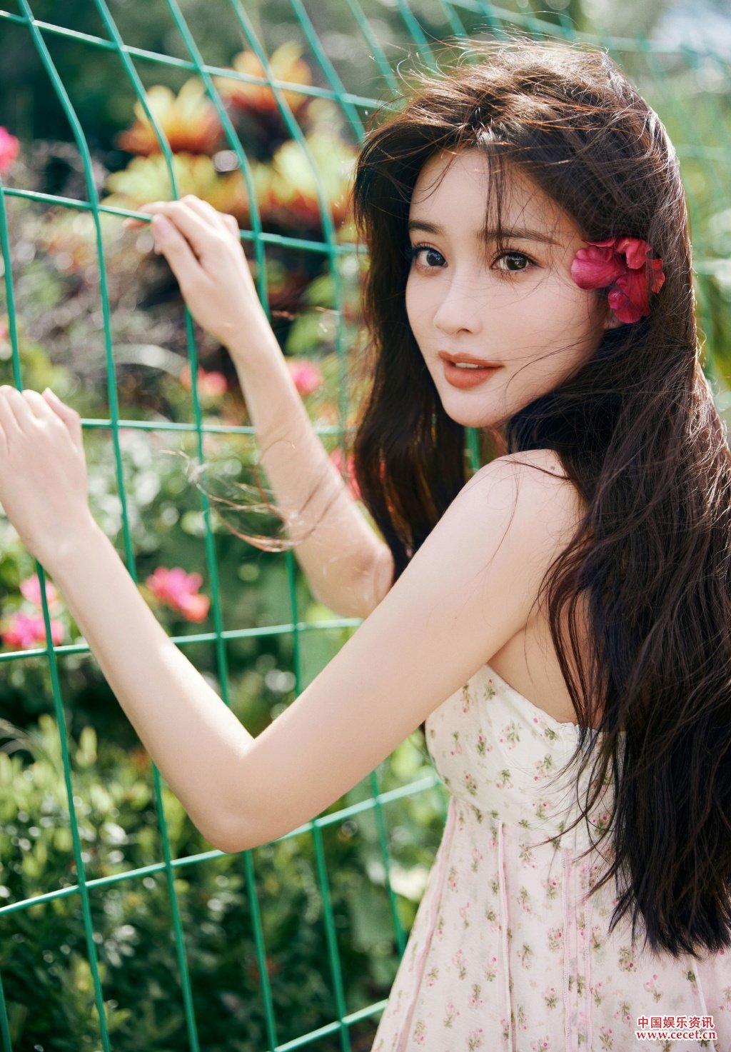 孟子義一襲清新碎花裙漫步在花叢旁仙影裊娜