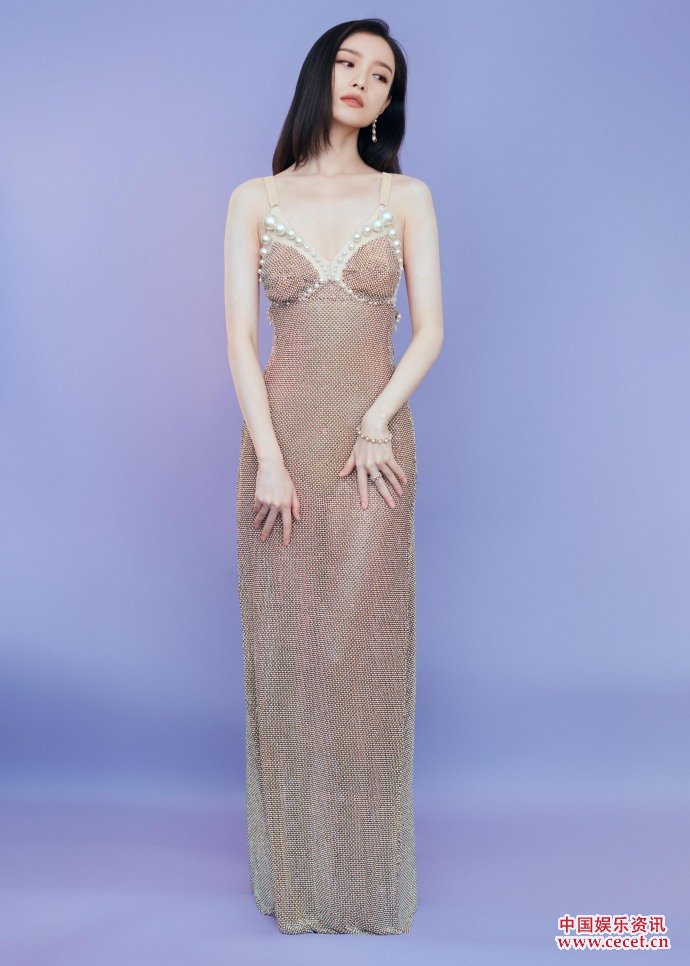 倪妮金色鑲珍珠吊帶透視裙 好身材一覽無(wú)遺