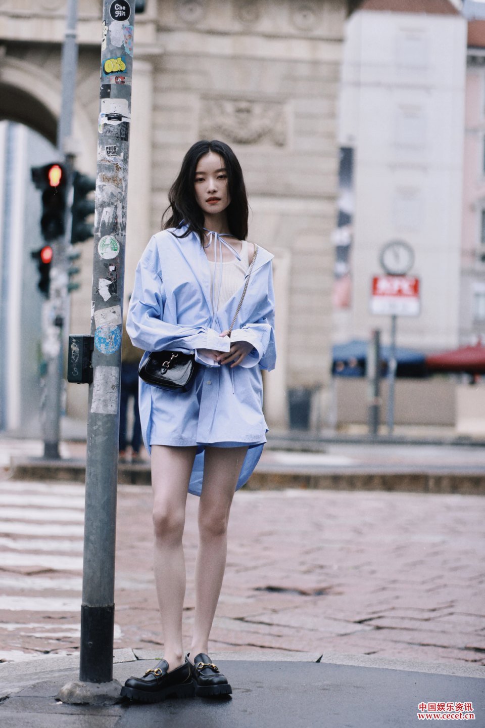 倪妮一身豎紋休閑套裝 在米蘭街頭盡顯隨性魅力