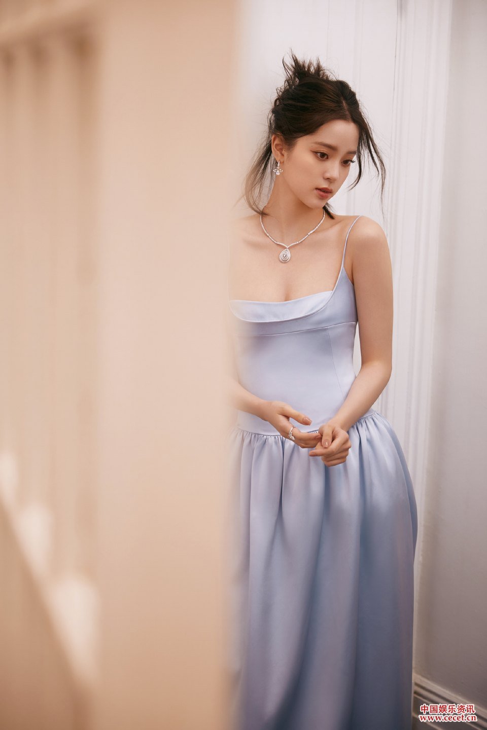歐陽(yáng)娜娜淡藍色吊帶裙 清純與優(yōu)雅渾然天成