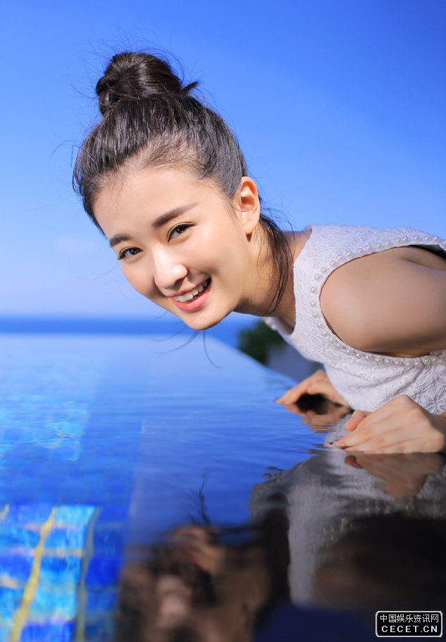 喬欣巴厘島寫(xiě)真照 可愛(ài)的丸子頭白色刺繡短裙