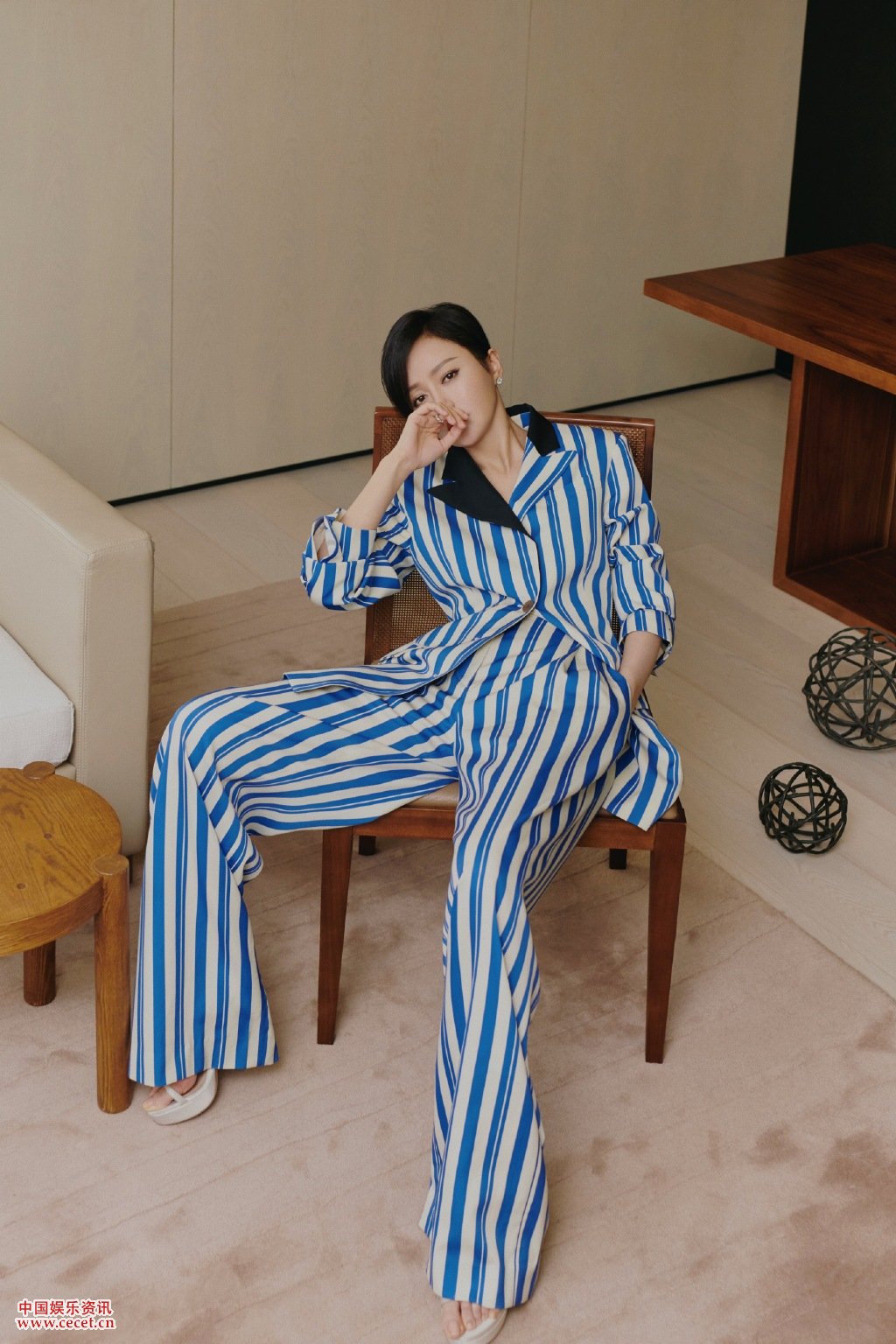 秦嵐藍白條紋套裝亮相 帥氣清冷霸氣十足
