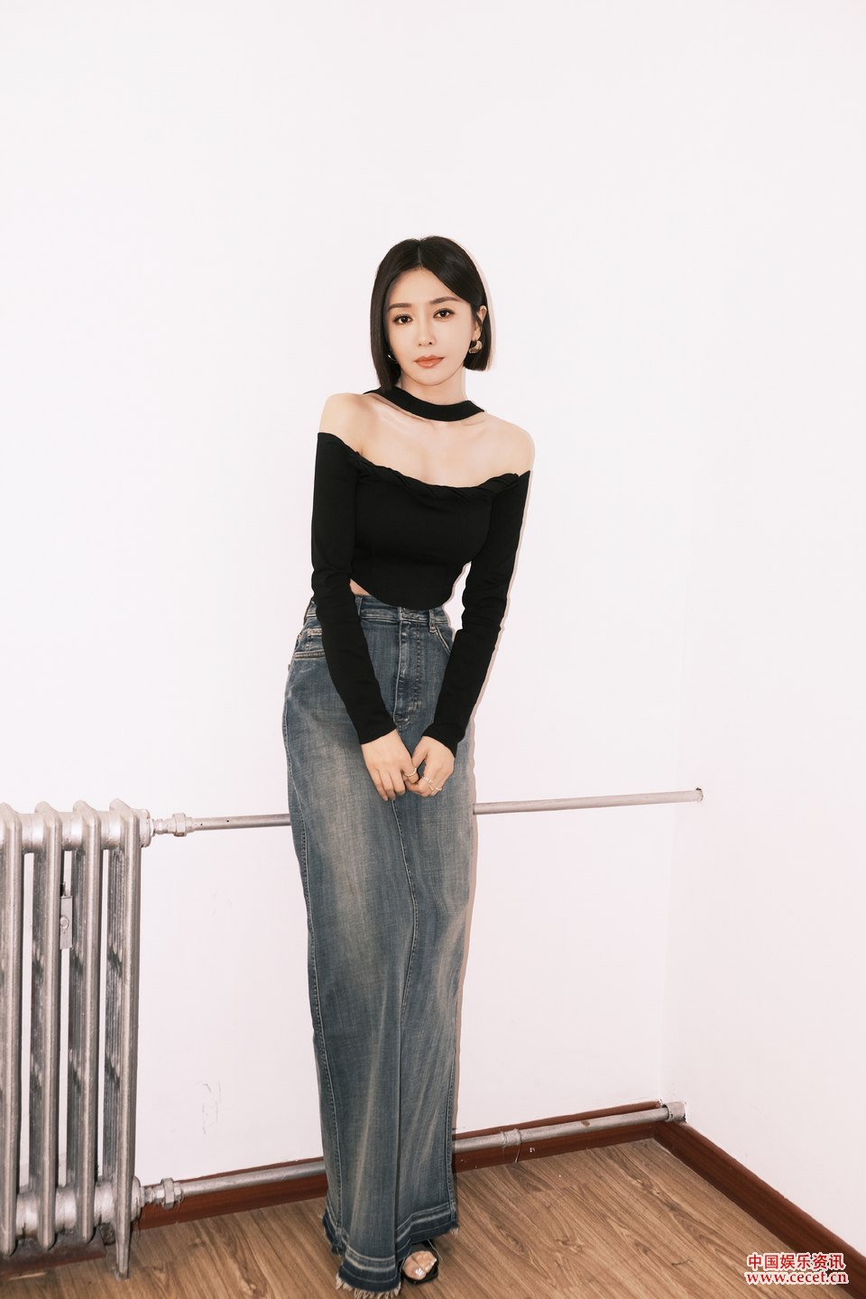 秦嵐低胸齊肩黑衣搭配牛仔長(cháng)裙盡顯明媚風(fēng)姿