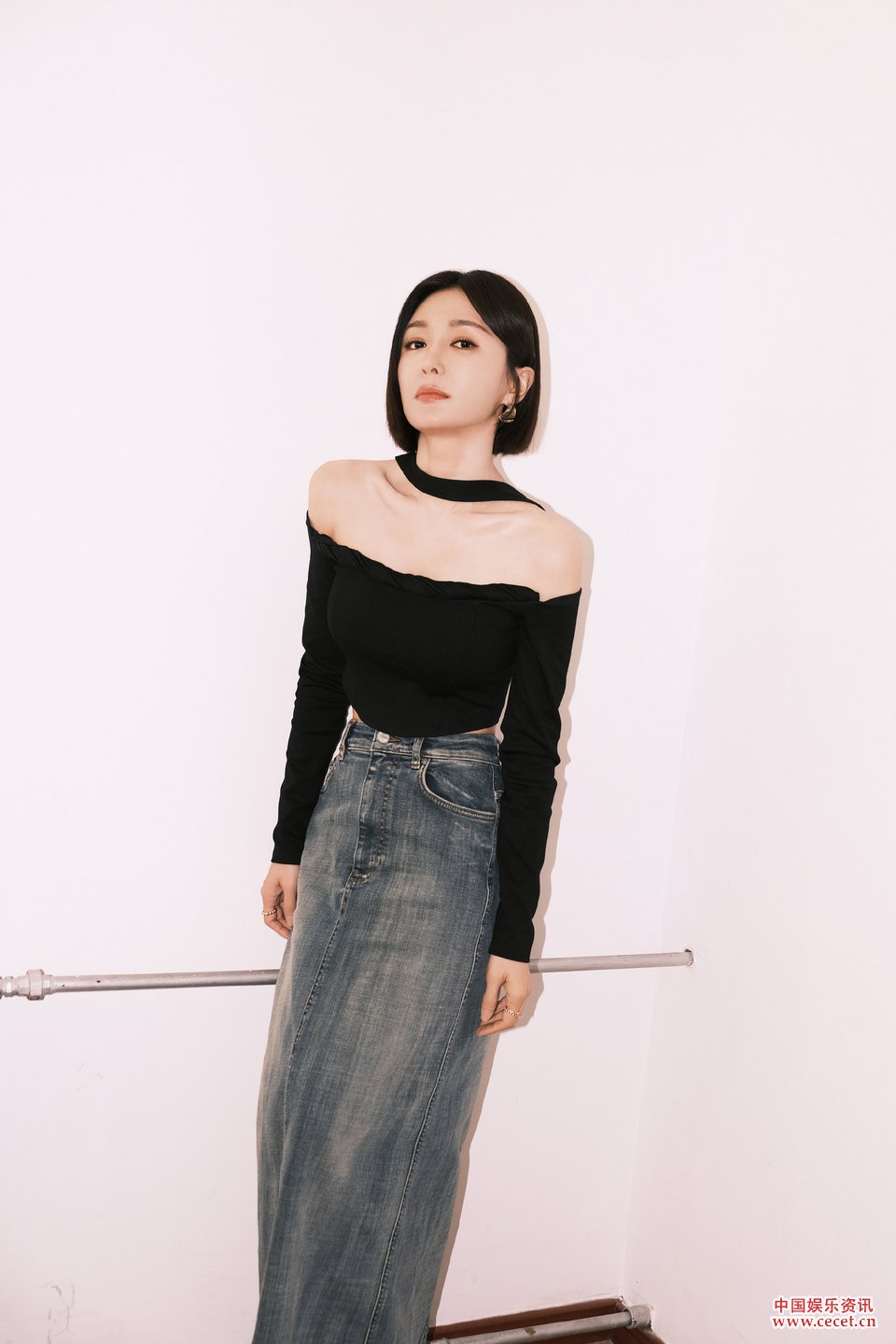 秦嵐低胸齊肩黑衣搭配牛仔長(cháng)裙盡顯明媚風(fēng)姿