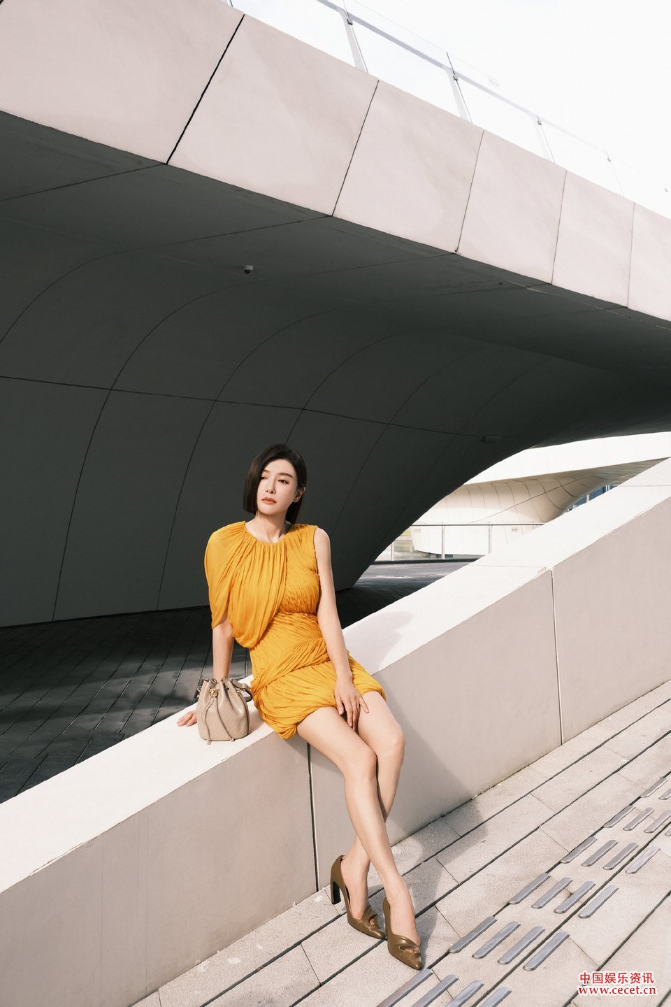 秦嵐身著(zhù)一抹落日暉黃感知初秋意蘊 詮釋幾何藝術(shù)