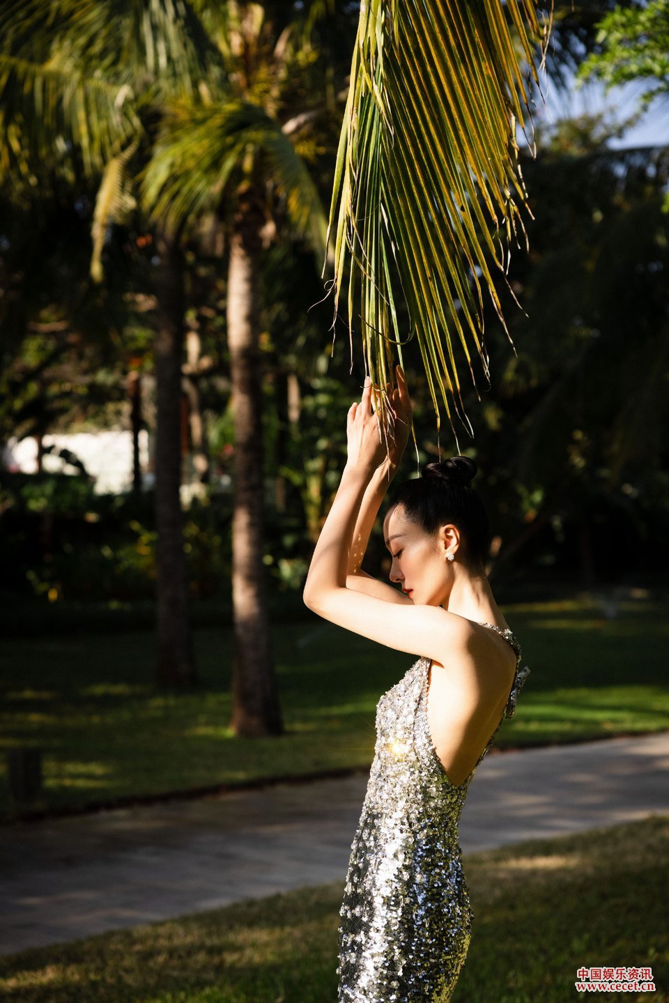 齊溪海南拍攝夢(mèng)境大片 銀色鑲鉆長(cháng)裙艷光四射