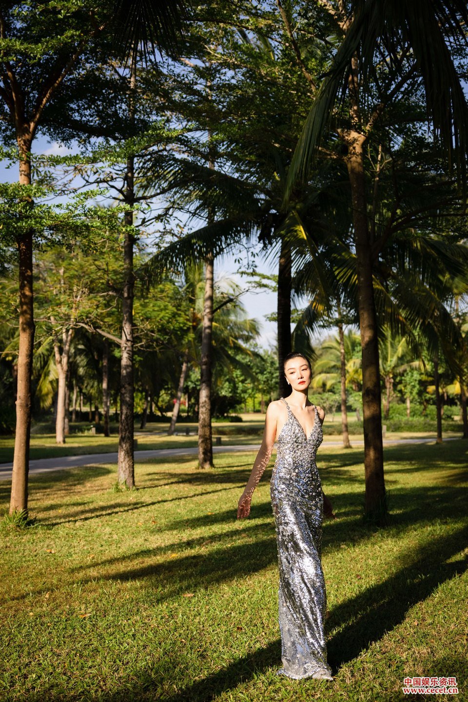 齊溪海南拍攝夢(mèng)境大片 銀色鑲鉆長(cháng)裙艷光四射