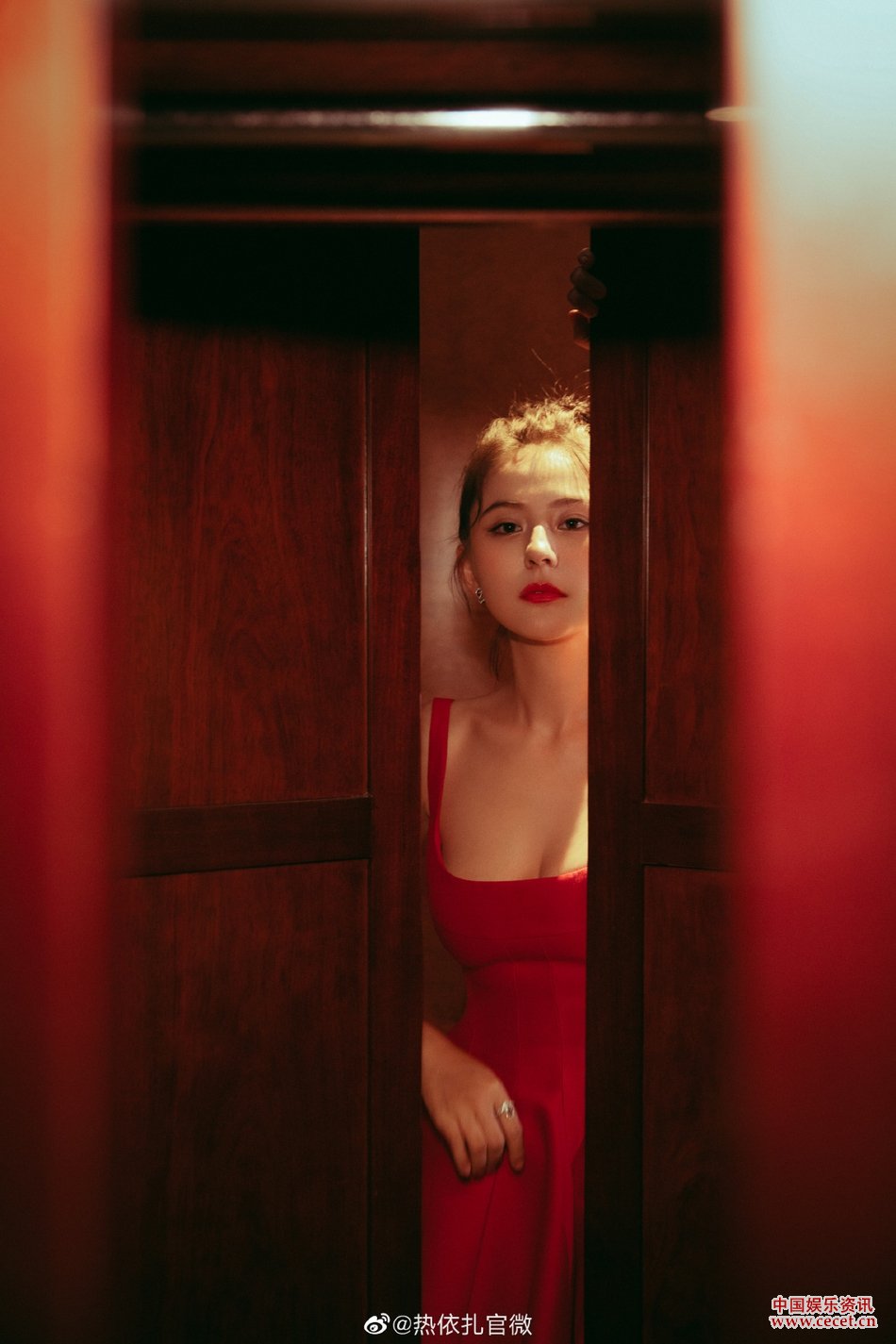 熱依扎吊帶紅裙照 身材豐腴充滿(mǎn)著(zhù)肉感和美感