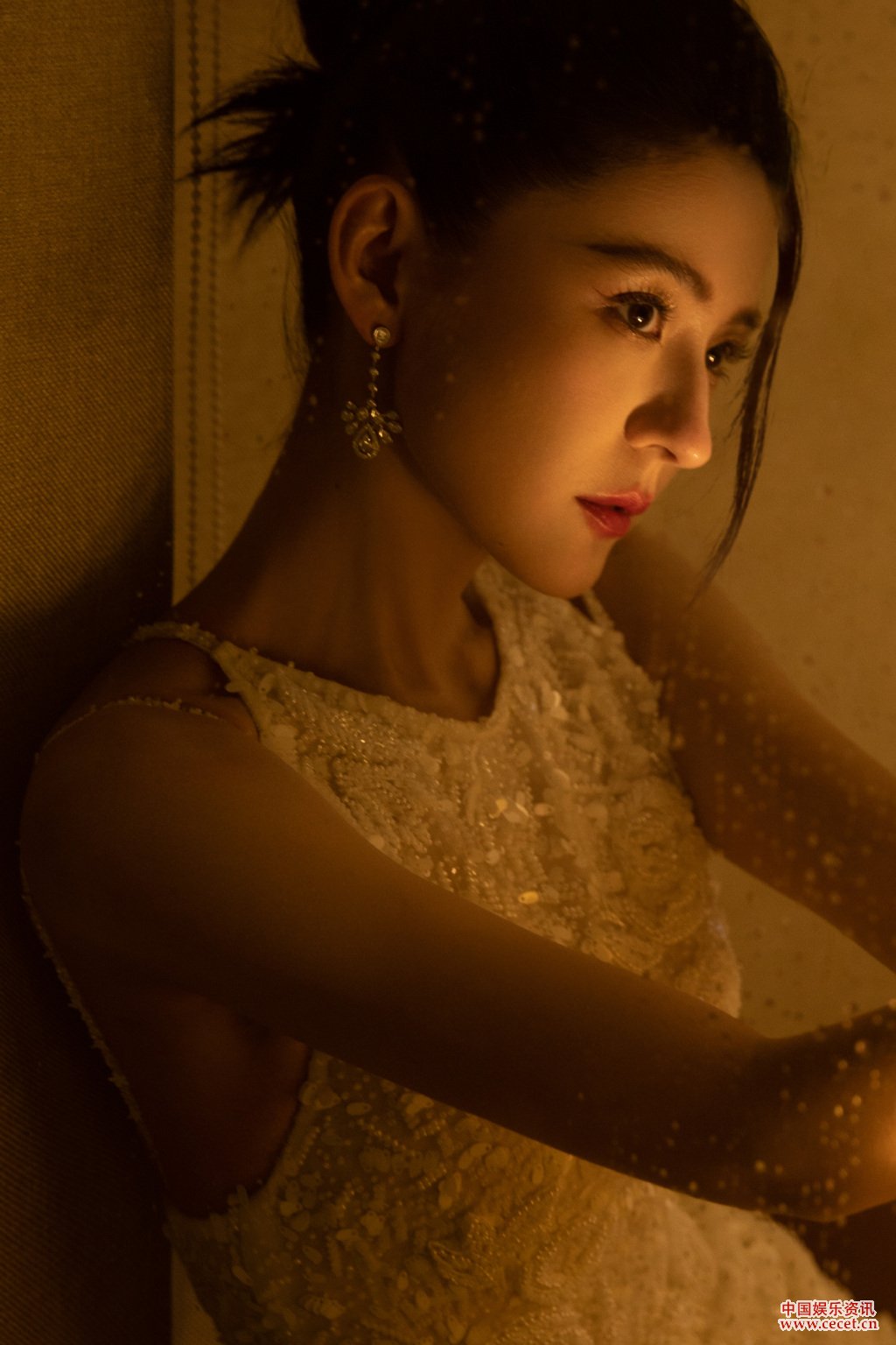 熱依扎白色釘珠長(cháng)裙搭配優(yōu)雅盤(pán)發(fā)清秀雋雅