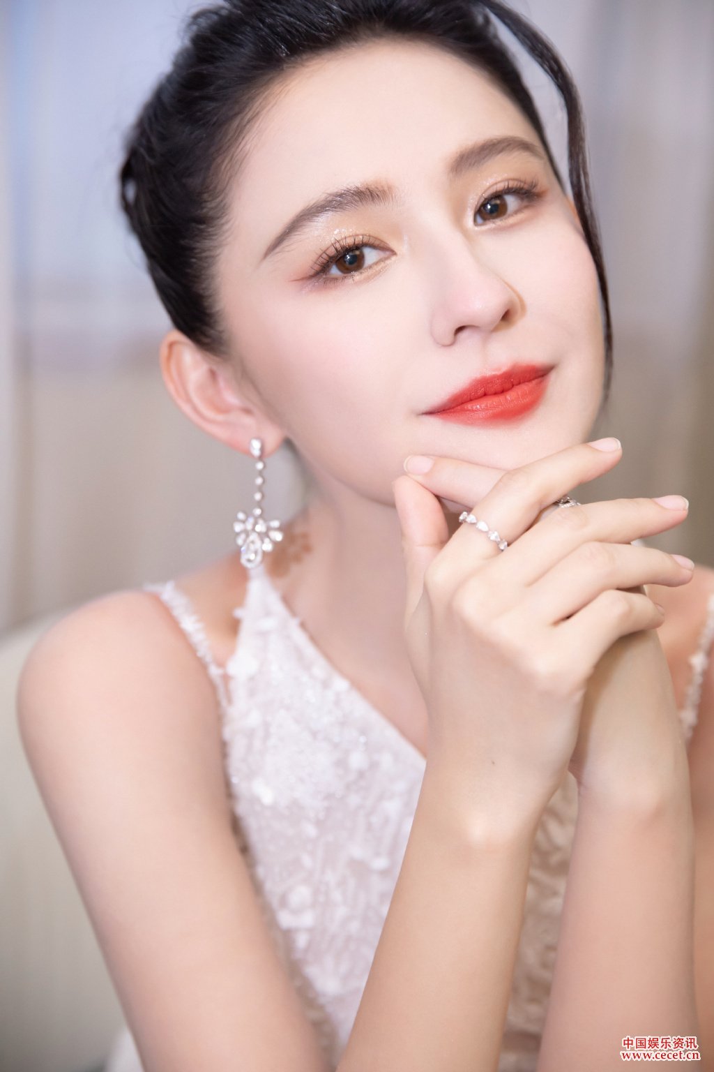 熱依扎白色釘珠長(cháng)裙搭配優(yōu)雅盤(pán)發(fā)清秀雋雅