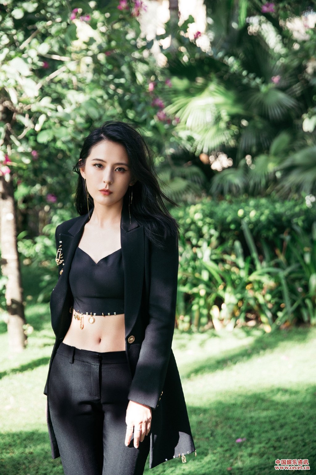 熱依扎黑色露腰西服搭配同色系開(kāi)叉褲裝展現酷颯