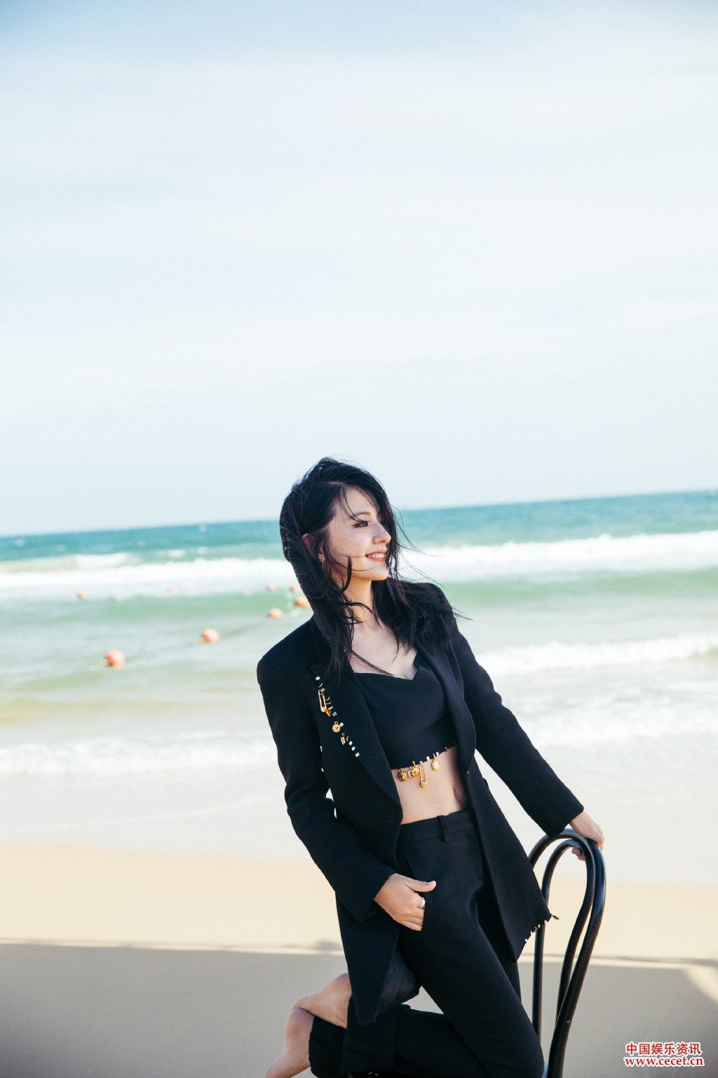熱依扎黑色露腰西服搭配同色系開(kāi)叉褲裝展現酷颯