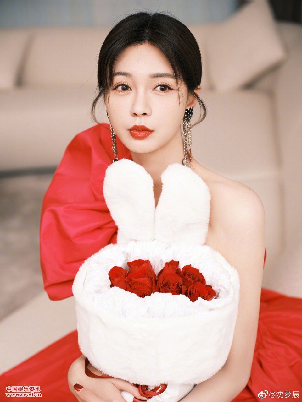 沈夢(mèng)辰大紅斜肩長(cháng)禮服 氣質(zhì)優(yōu)雅明媚動(dòng)人