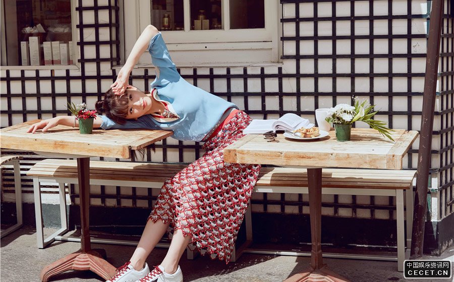 施詩(shī)紅白格魚(yú)尾裙出鏡 自然隨性不失俏皮可愛(ài)