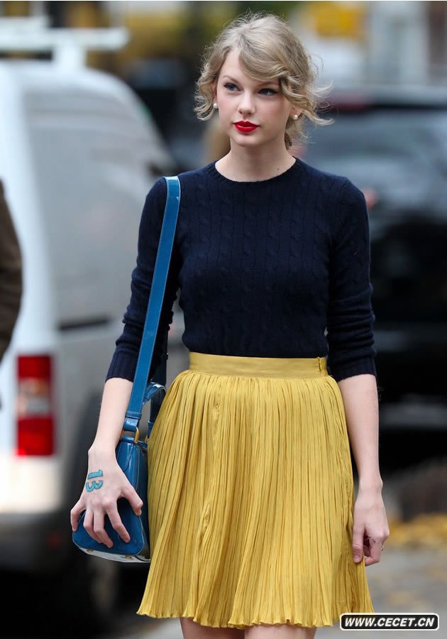 泰勒-斯威夫特街拍 深藍色毛衣搭百褶裙