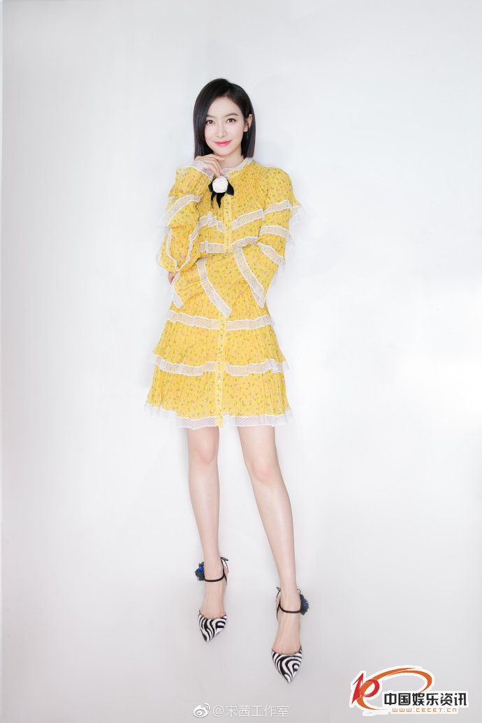 宋茜鵝黃色碎花連衣裙美照 甜美微笑長(cháng)腿矚目