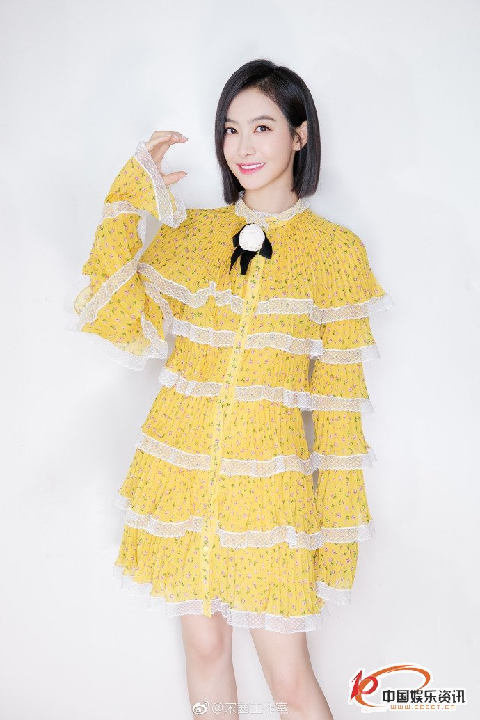 宋茜鵝黃色碎花連衣裙美照 甜美微笑長(cháng)腿矚目