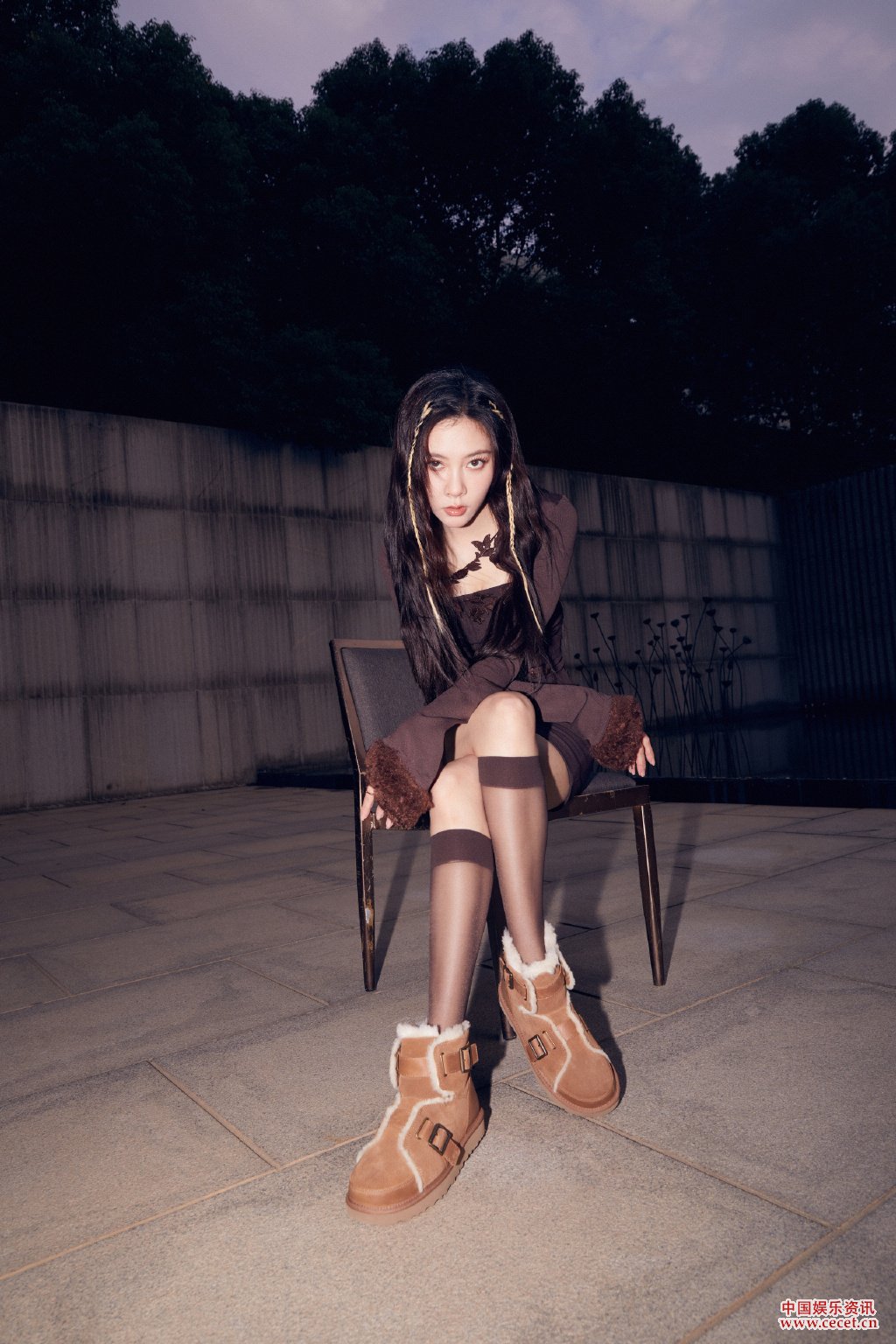 宋妍霏棕色刺繡吊帶連衣裙搭配雪地靴設計感十足