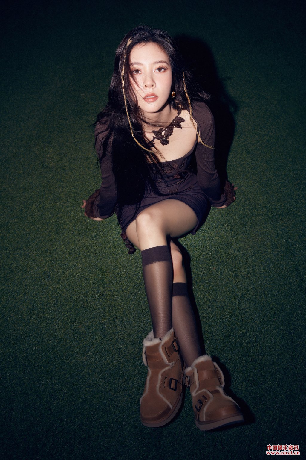 宋妍霏棕色刺繡吊帶連衣裙搭配雪地靴設計感十足