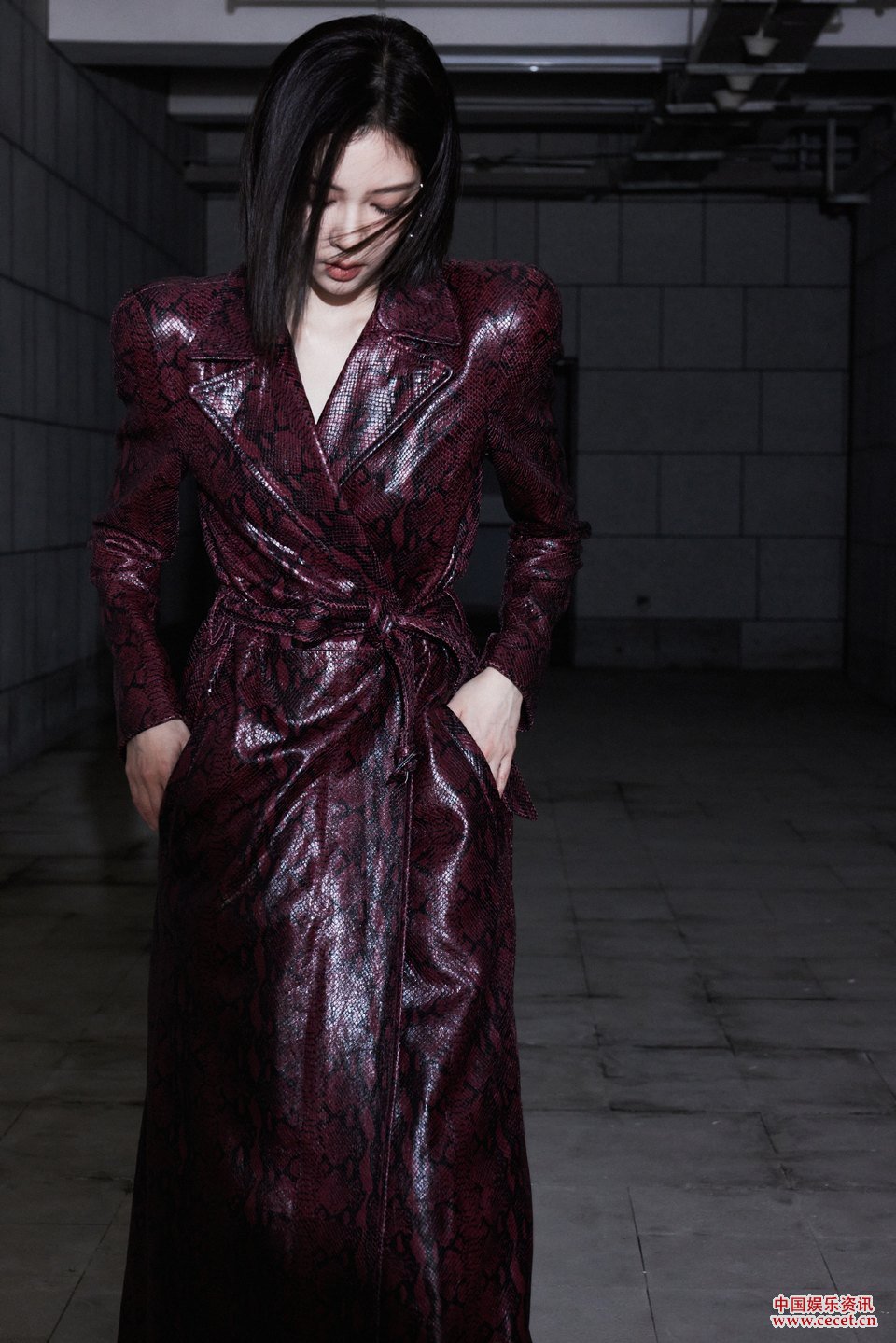 宋妍霏身著(zhù)酒紅色長(cháng)皮衣 利落短發(fā)干練颯爽