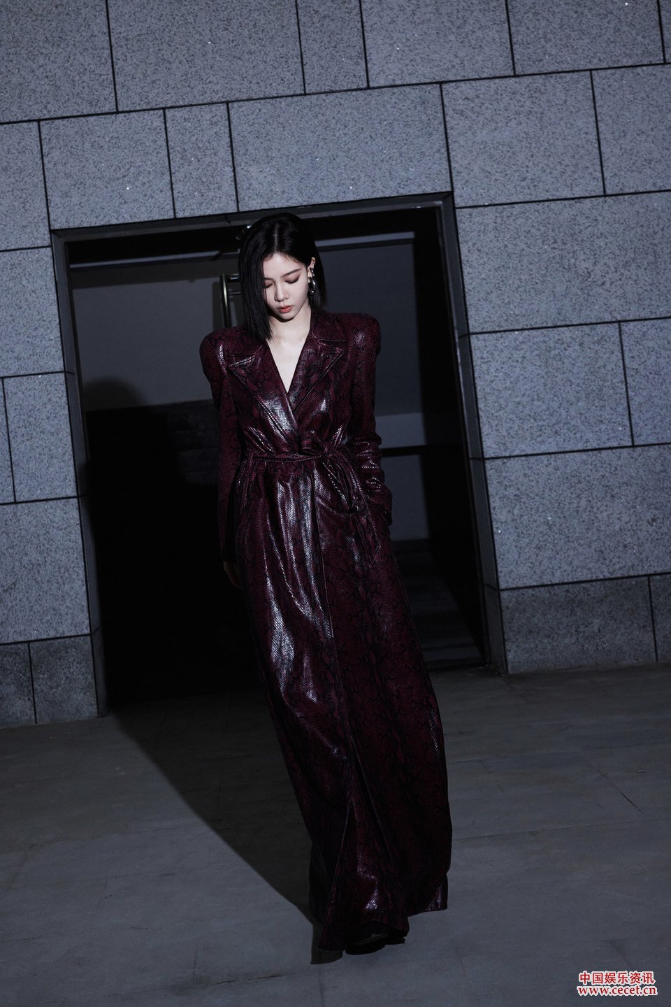 宋妍霏身著(zhù)酒紅色長(cháng)皮衣 利落短發(fā)干練颯爽