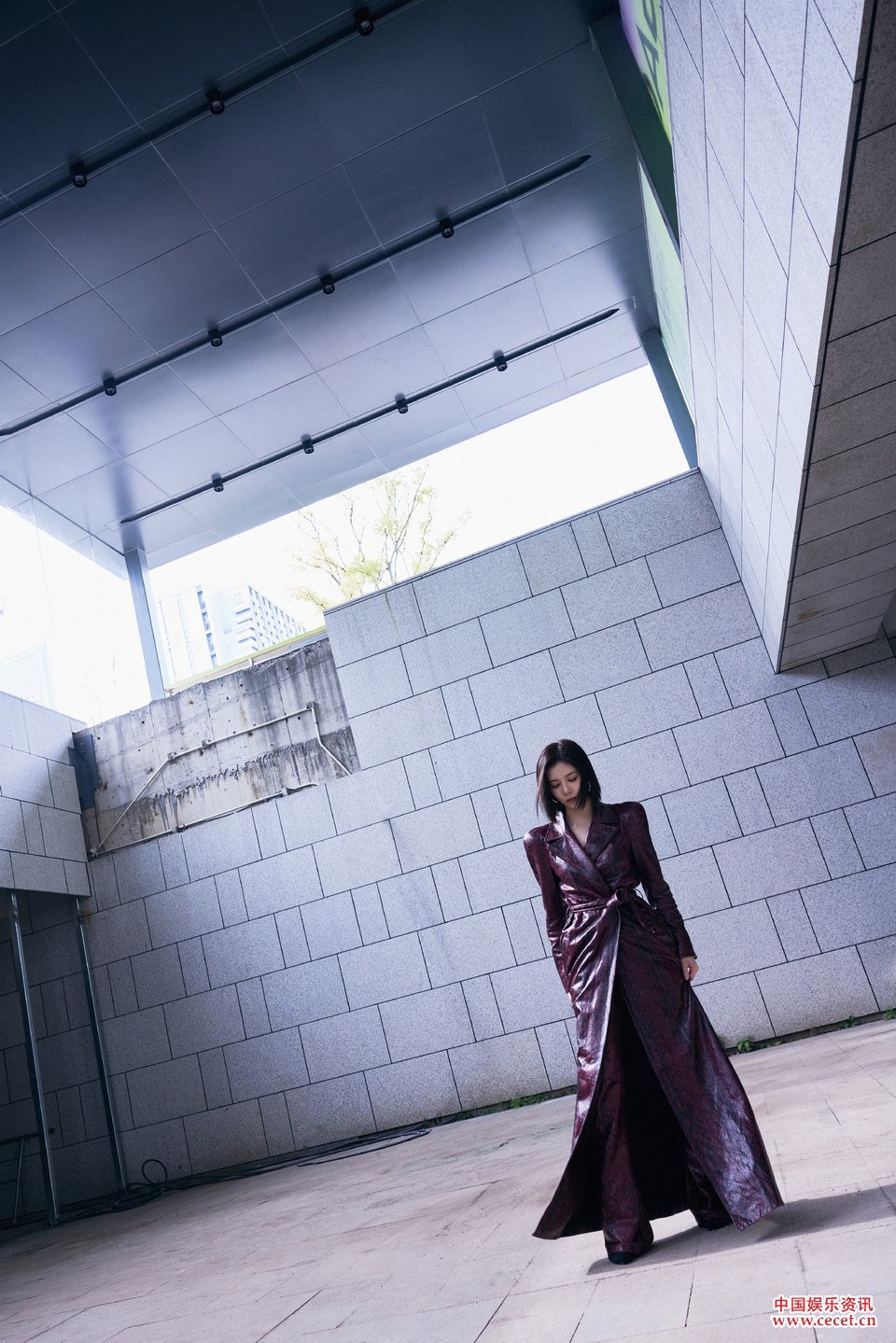 宋妍霏身著(zhù)酒紅色長(cháng)皮衣 利落短發(fā)干練颯爽