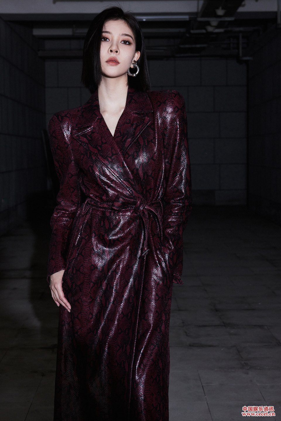 宋妍霏身著(zhù)酒紅色長(cháng)皮衣 利落短發(fā)干練颯爽