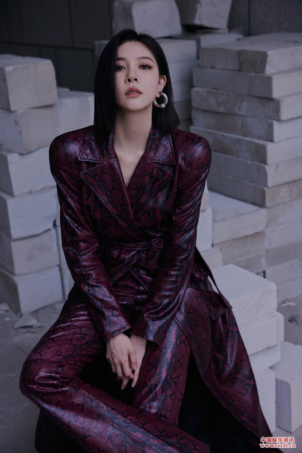 宋妍霏身著(zhù)酒紅色長(cháng)皮衣 利落短發(fā)干練颯爽