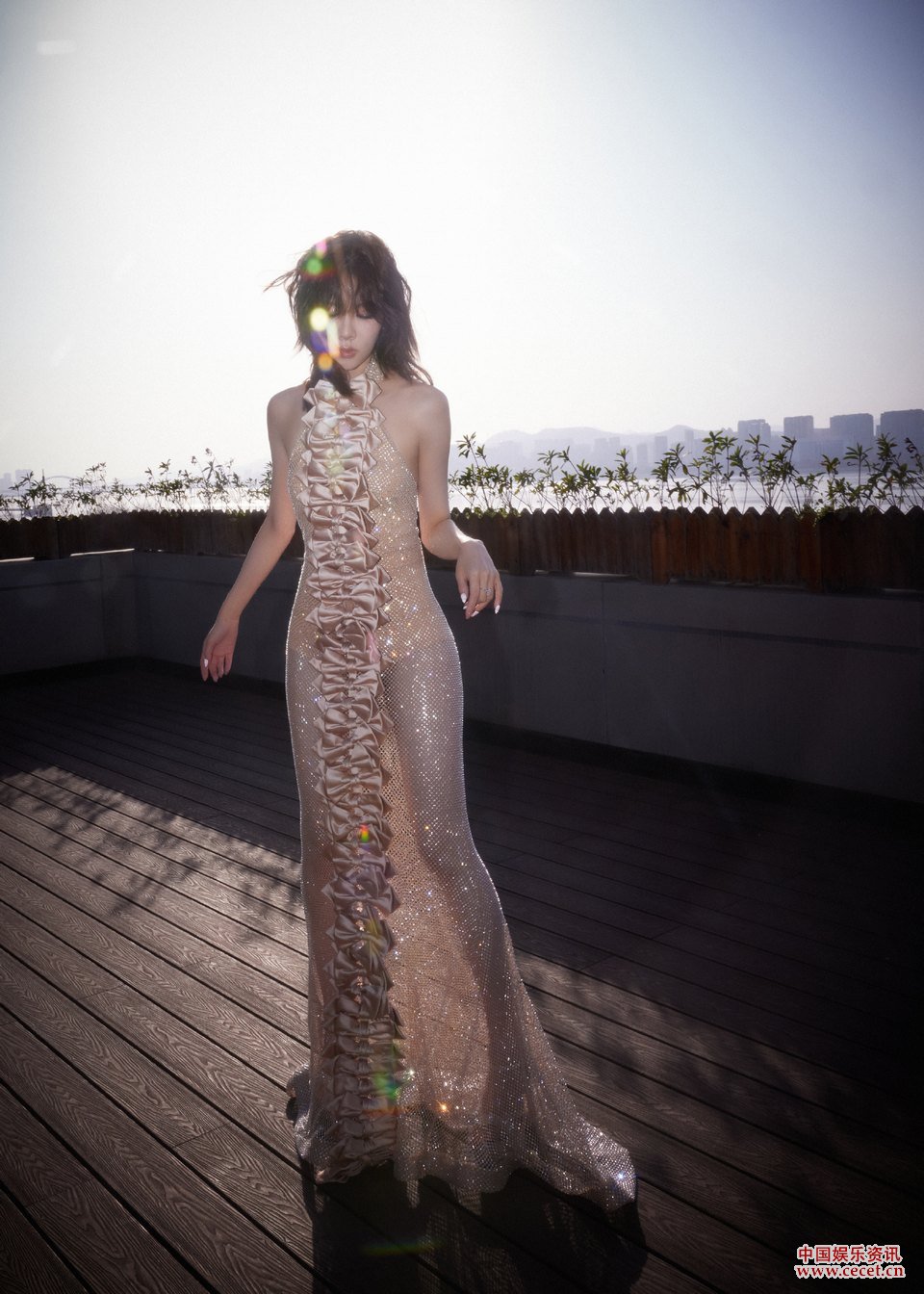 宋妍霏肉粉色鏤空魚(yú)尾裙 裙身鑲鉆點(diǎn)亮潮流之夜