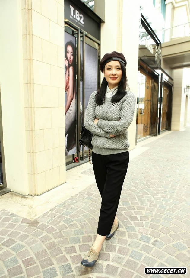 孫寧街拍LOOK 灰色針織衫搭配休閑七分褲