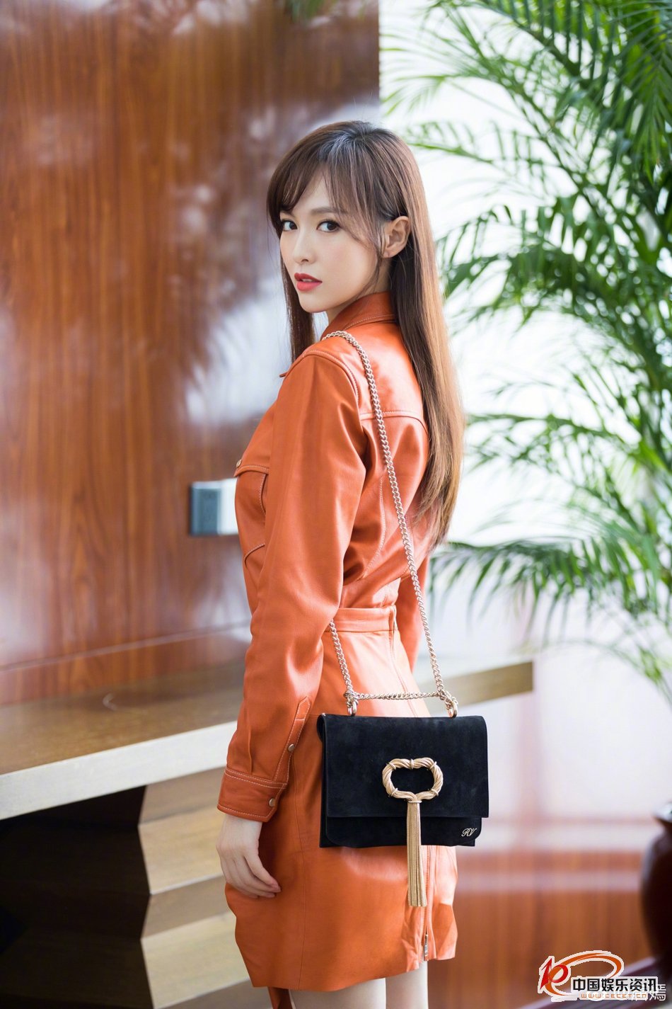 唐嫣橘色皮連衣裙亮相 回眸眼神御姐范兒十足