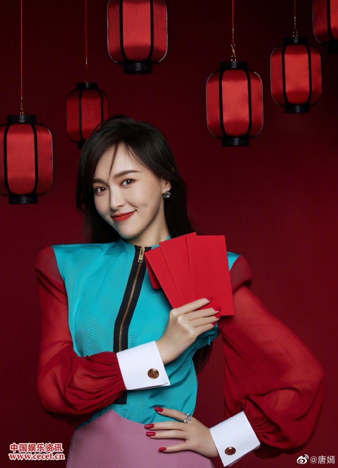 唐嫣紅包大片 站在紅色背景前手持紅包狀態(tài)很好