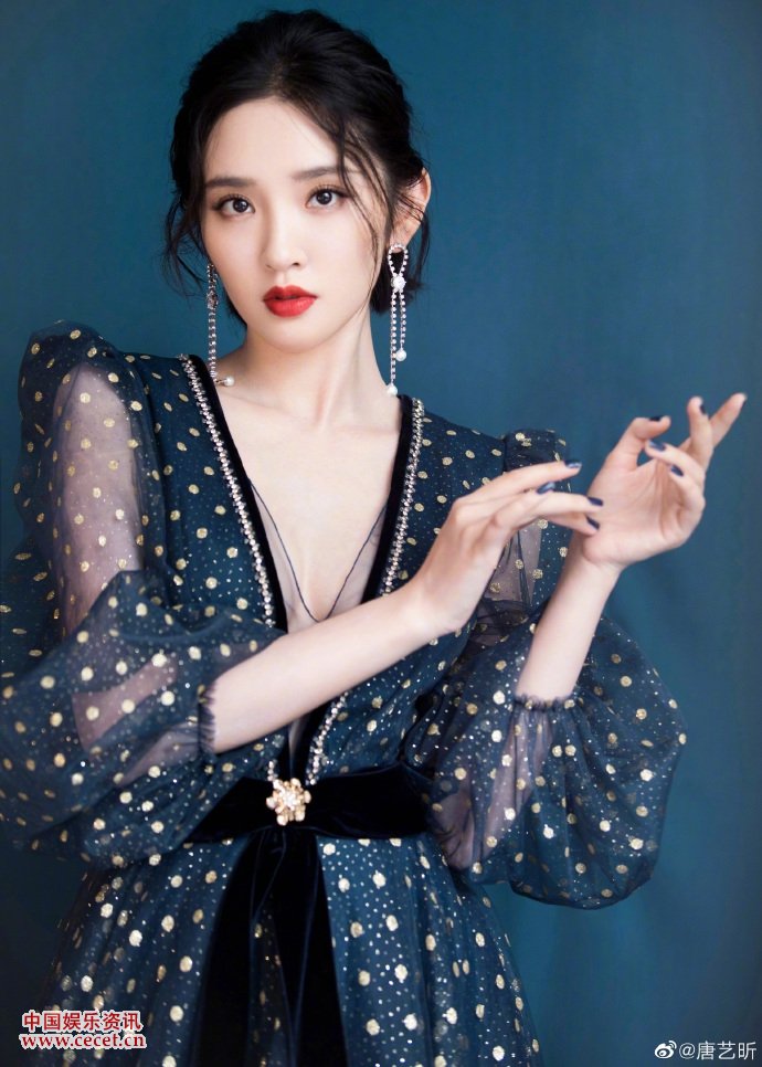 唐藝昕美照妝容精致 身穿深V薄紗長(cháng)裙小露后背