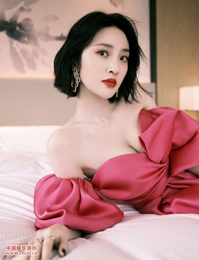 唐藝昕玫紅色V領(lǐng)抹胸裙 酥胸隱現性感撩人