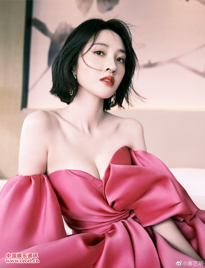 唐藝昕玫紅色V領(lǐng)抹胸裙 酥胸隱現性感撩人