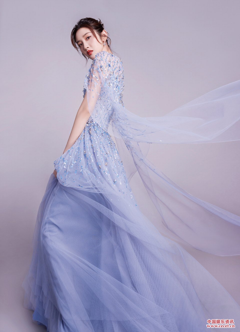 唐藝昕藍色薄紗長(cháng)裙照 如幻若影優(yōu)雅綻放