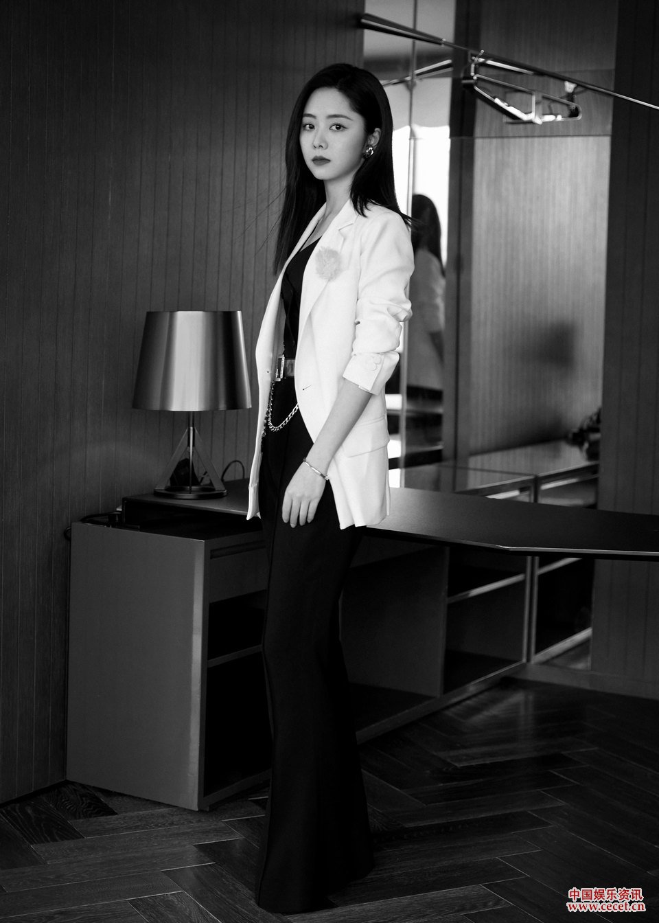 譚松韻黑色褲裝搭配白色西裝冷峻與優(yōu)雅并存