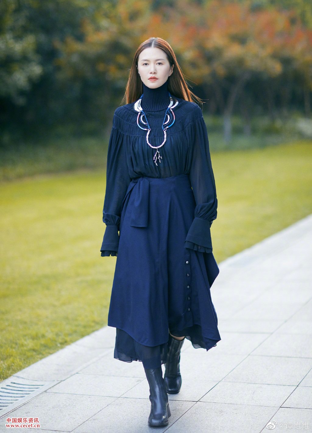 譚維維藍色素裝出街 犀利的眼神時(shí)尚女王