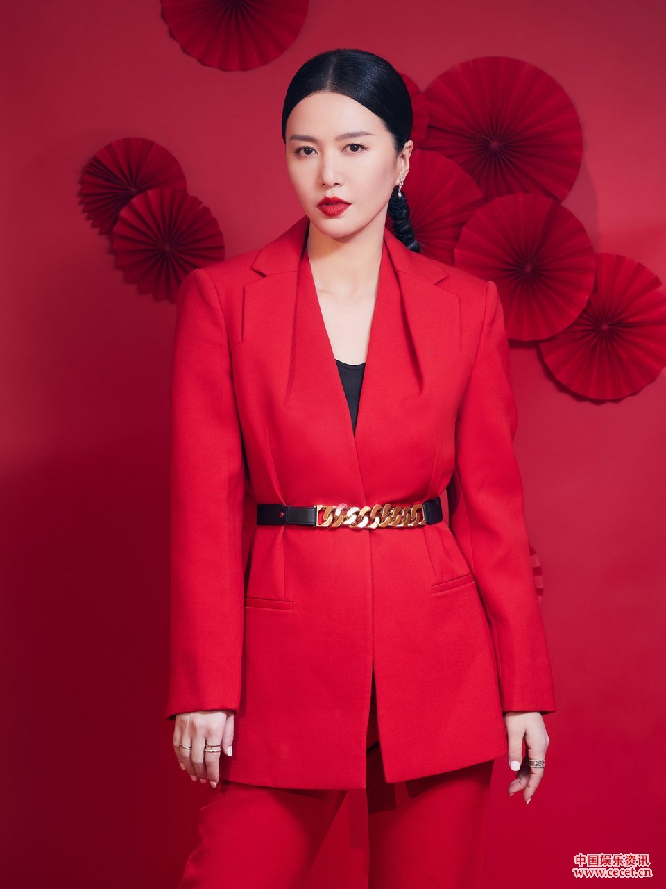 譚維維紅色套裝喜慶照 束發(fā)紅唇風(fēng)情萬(wàn)種