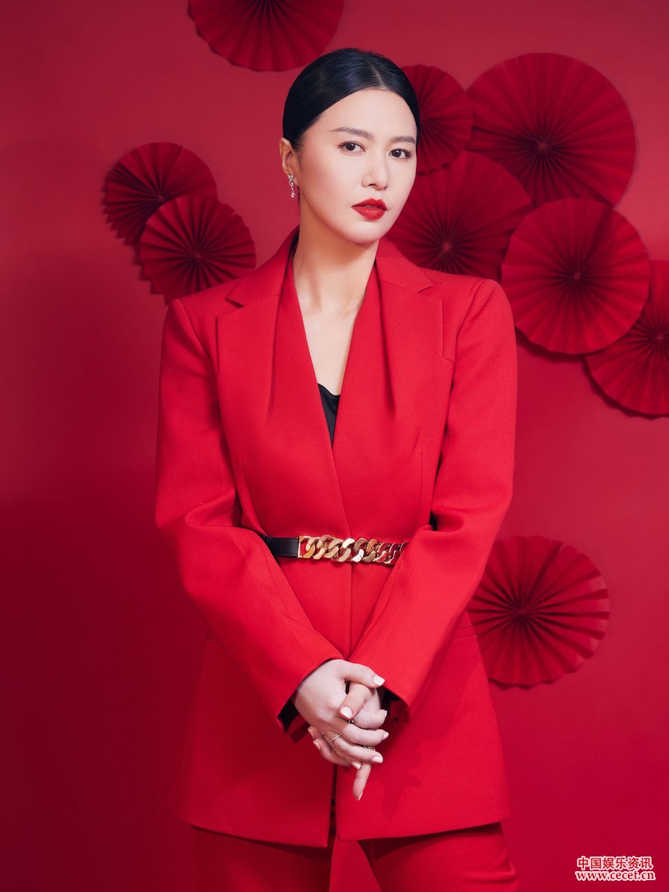 譚維維紅色套裝喜慶照 束發(fā)紅唇風(fēng)情萬(wàn)種