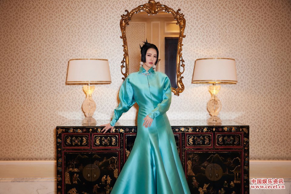 譚維維藍色復古長(cháng)裙照 強大的氣場(chǎng)不可抵擋